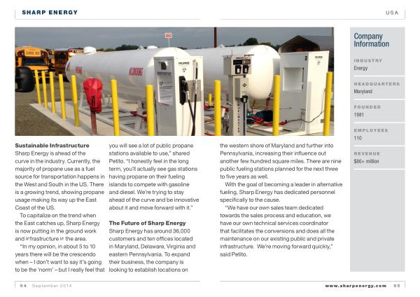Sustainable Infrastructure Sharp Energy is ahead of the curve in the industry . Currently , the majority of propane use as a fuel source for transportation happens in the West and South in the US . There is a growing trend , showing propane usage making its way up the East Coast of the US .