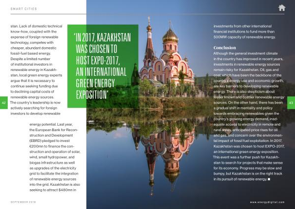 ‘ IN 2017 , KAZAKHSTAN WAS CHOSEN TO HOST EXPO-2017 , AN INTERNATIONAL GREEN ENERGY EXPOSITION ’ energy potential . Last year , the European Bank for Reconstruction and Development ( EBRD ) pledged to invest € 200mn to finance the construction and operation of solar , wind , small hydropower , and biogas infrastructure as well as upgrades of the electricity grid to facilitate the integration of renewable energy sources into the grid . Kazakhstan is also seeking to attract $ 480mn in