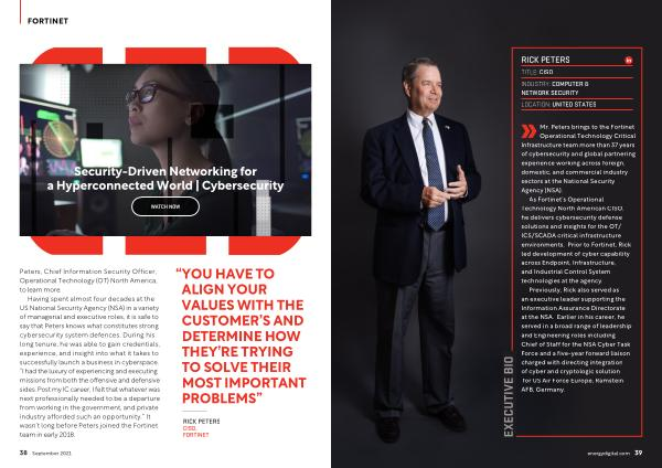 Having spent almost four decades at the US National Security Agency ( NSA ) in a variety of managerial and executive roles , it is safe to say that Peters knows what constitutes strong cybersecurity system defences . During his long tenure , he was able to gain credentials , experience , and insight into what it takes to successfully launch a business in cyberspace . “ I had the luxury of experiencing and executing missions from both the offensive and defensive sides . Post my IC career , I felt that whatever was next professionally needed to be a departure from working in the government , and private industry afforded such an opportunity .” It wasn ’ t long before Peters joined the Fortinet team in early 2018 .