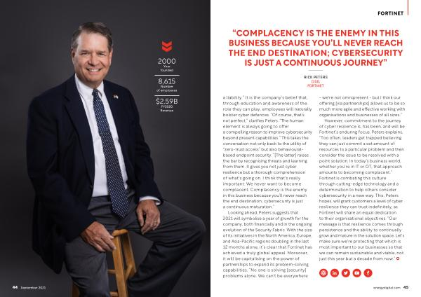 However , commitment to the journey of cyber resilience is , has been , and will be Fortinet ’ s enduring focus . Peters explains , “ Too often , leaders get trapped believing they can just commit a set amount of resources to a particular problem and then consider the issue to be resolved with a point solution . In today ’ s business world , whether you ' re in IT or OT , that approach amounts to becoming complacent .” Fortinet is combating this culture through cutting-edge technology and a determination to help others consider cybersecurity in a new way . This , Peters hopes , will grant customers a level of cyber resilience they can trust indefinitely , as Fortinet will share an equal dedication to their organisational objectives . “ Our message is that resilience comes through persistence and the ability to continually grow and mature in the solution space . Let ' s make sure we ' re protecting that which is most important to our businesses so that we can remain sustainable and viable , not just this year but a decade from now .”