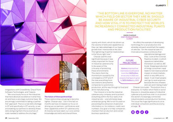 Chassar concludes : “ The bottom line is everyone , no matter which field or sector they are in , should be aware of industrial cybersecurity and how vital it is to protect the world ’ s increasingly connected industrial plants and production facilities . This issue has huge significance to us as individual consumers and the economy at large .” energydigital . com 69
