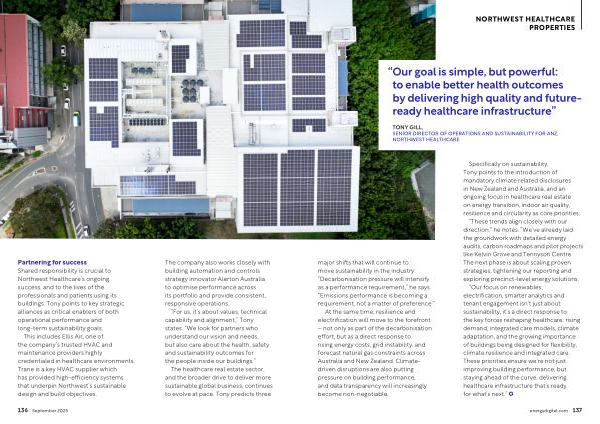 “ Our focus on renewables, electrification, smarter analytics and tenant engagement isn’ t just about sustainability, it’ s a direct response to the key forces reshaping healthcare: rising demand, integrated care models, climate adaptation, and the growing importance of buildings being designed for flexibility, climate resilience and integrated care. These priorities ensure we’ re not just improving building performance, but staying ahead of the curve, delivering healthcare infrastructure that’ s ready for what’ s next.” energydigital. com 137