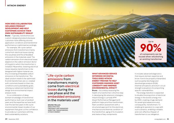 WHAT ADVANCED SERVICE OFFERINGS OR DIGITAL TOOLS DOES HITACHI ENERGY PROVIDE TO HELP CUSTOMERS MAXIMISE ASSET LONGEVITY AND MINIMISE ENVIRONMENTAL IMPACT? Bruno – Accurately assessing the health of a transformer is the first step in developing life extension strategies. Hitachi Energy’ s Lumada APM( Asset Performance Management) platform helps prioritise transformers fleet condition assessment with a structured approach for the electrical, mechanical and thermal condition of the transformer, aging of its insulation and status of key components.