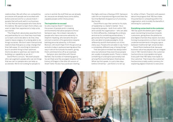 Everything comes back to the customer YBS has spent the better part of eight years reorienting its business towards customers : giving them the platforms and digital channels they expect , but also honing its propositions so that it can meet underserved demand in the grey space between traditional high-street lenders . David Morris believes that , because business value has played such an integral role in YBS ’ transformation , the customer has become an inescapable end-goal . Every path that YBS takes now leads to the customer . That means the customer has become a really useful currency for explaining digital initiatives to executive