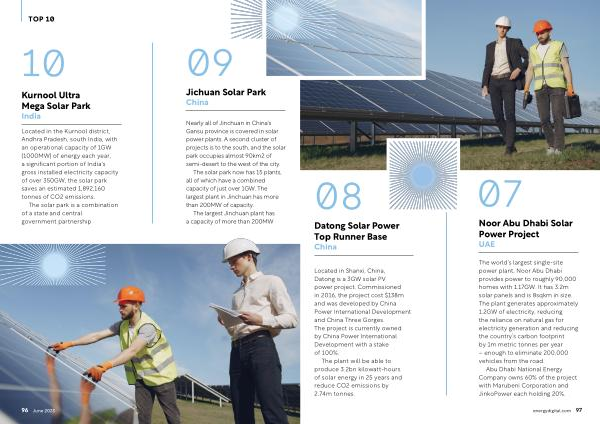 The world ’ s largest single-site power plant , Noor Abu Dhabi provides power to roughly 90,000 homes with 1.17GW . It has 3.2m solar panels and is 8sqkm in size . The plant generates approximately 1.2GW of electricity , reducing the reliance on natural gas for electricity generation and reducing the country ’ s carbon footprint by 1m metric tonnes per year – enough to eliminate 200,000 vehicles from the road .